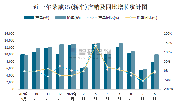 近一年榮威I5(轎車)產銷及同比增長統計圖
