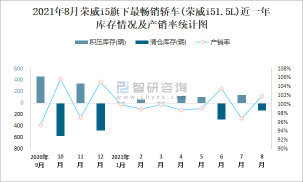 2021年8月榮威I5旗下最暢銷車(榮威i51.5L)近一年庫存情況及產銷率統計圖
