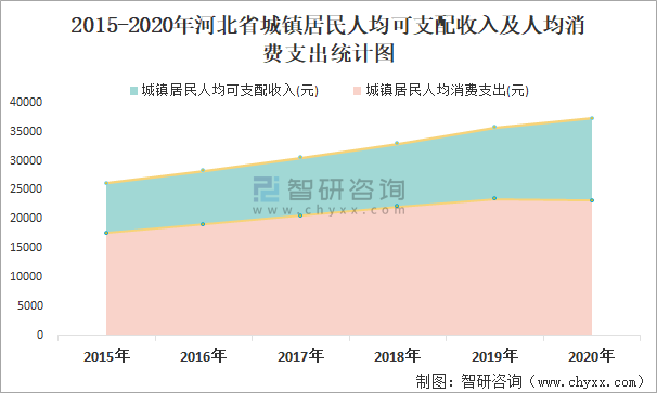 2015-2020年河北省城鎮(zhèn)居民人均可支配收入及人均消費(fèi)支出統(tǒng)計圖