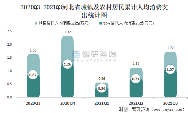 2020Q3-2021Q3河北省城鎮(zhèn)及農(nóng)村居民累計人均消費(fèi)支出統(tǒng)計圖