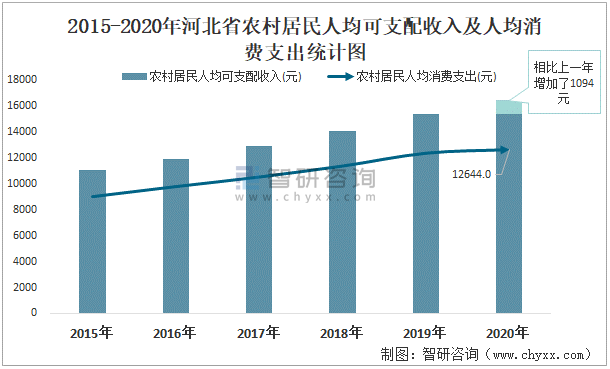 2015-2020年河北省農(nóng)村居民人均可支配收入及人均消費(fèi)支出統(tǒng)計圖