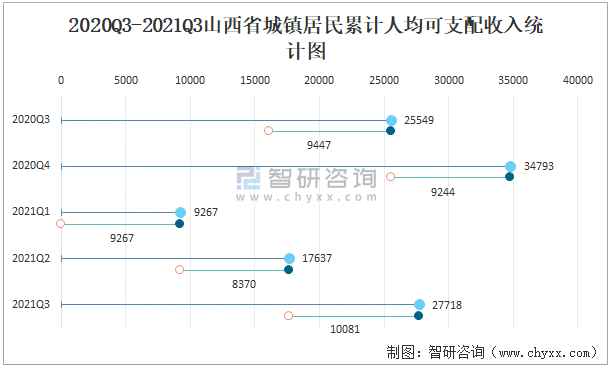2020Q3-2021Q3山西省城鎮居民累計人均可支配收入統計圖
