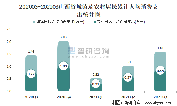 2020Q3-2021Q3山西省城鎮及農村居民累計人均消費支出統計圖