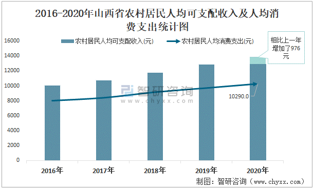 2015-2020年山西省農村居民人均可支配收入及人均消費支出統計圖