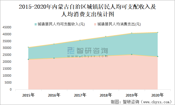 2015-2020年內(nèi)蒙古自治區(qū)城鎮(zhèn)居民人均可支配收入及人均消費(fèi)支出統(tǒng)計(jì)圖