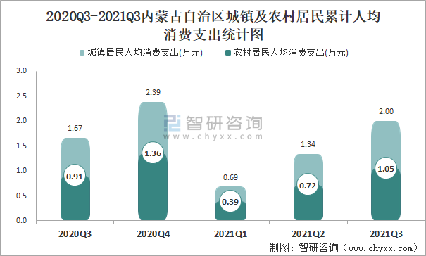 2020Q3-2021Q3內(nèi)蒙古自治區(qū)城鎮(zhèn)及農(nóng)村居民累計(jì)人均消費(fèi)支出統(tǒng)計(jì)圖
