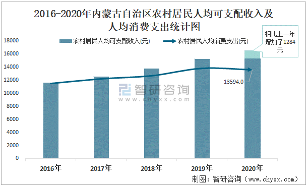 2015-2020年內(nèi)蒙古自治區(qū)農(nóng)村居民人均可支配收入及人均消費(fèi)支出統(tǒng)計(jì)圖