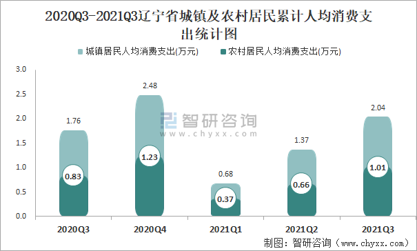 根據國家統計局數據顯示:2021年第三季度遼寧省城鎮居民人均消費支出為2.04萬元,同比增長15.75%,農村居民人均消費支出為1.01萬元,同比增長21.63%,城鎮居民人均消費支出是農村居民人均消費支出的2.02倍;2021年第三季度遼寧省城鎮居民人均消費支出占2020Q3-2021Q3遼寧省城鎮居民人均消費支出的24.48%,農村居民人均消費支出占比達到24.65%。