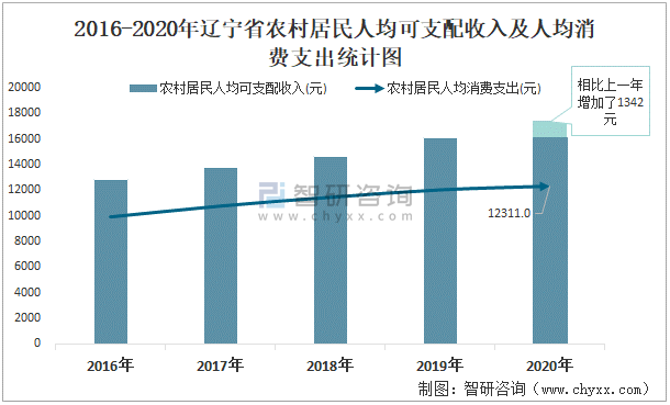 2015-2020年遼寧省農村居民人均可支配收入及人均消費支出統計圖