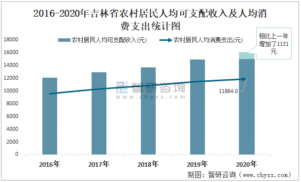 2015-2020年吉林省農(nóng)村居民人均可支配收入及人均消費支出統(tǒng)計圖