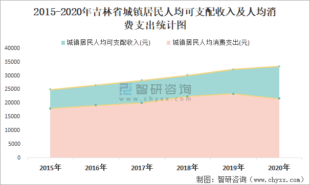 2015-2020年吉林省城鎮(zhèn)居民人均可支配收入及人均消費支出統(tǒng)計圖