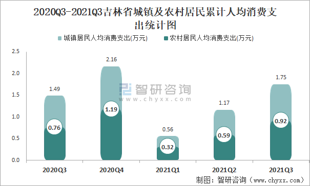 2020Q3-2021Q3吉林省城鎮(zhèn)及農(nóng)村居民累計人均消費支出統(tǒng)計圖