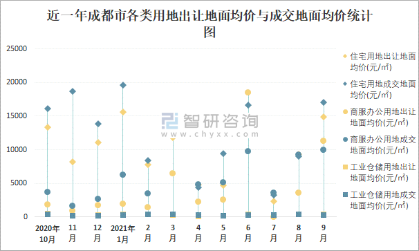 近一年成都市各類用地出讓地面均價與成交地面均價統計圖