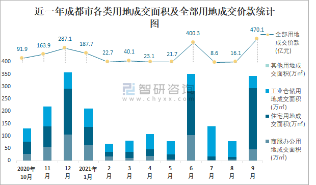 近一年成都市各類用地成交面積及全部用地成交價款統計圖