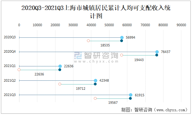 2020Q3-2021Q3上海市城鎮居民累計人均可支配收入統計圖