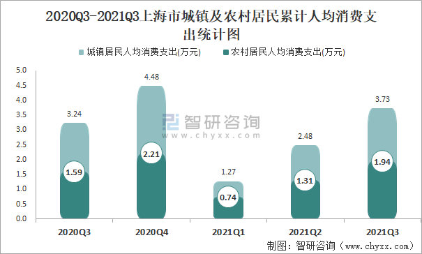 根據國家統計局數據顯示:2021年第三季度上海市城鎮居民人均消費支出為3.73萬元,同比增長15.22%,農村居民人均消費支出為1.94萬元,同比增長22.4%,城鎮居民人均消費支出是農村居民人均消費支出的1.92倍;2021年第三季度上海市城鎮居民人均消費支出占2020Q3-2021Q3上海市城鎮居民人均消費支出的24.53%,農村居民人均消費支出占比達到24.93%。