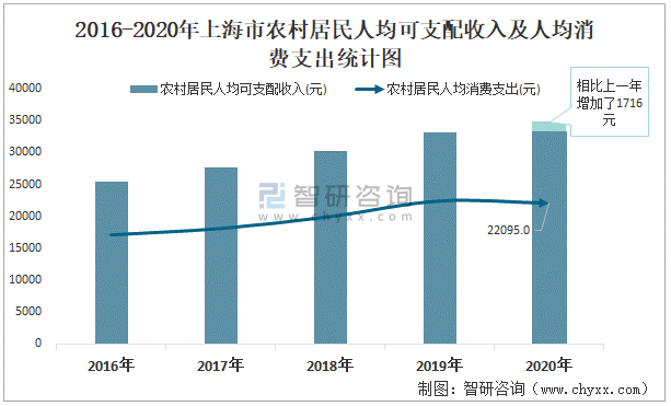 2015-2020年上海市農村居民人均可支配收入及人均消費支出統計圖
