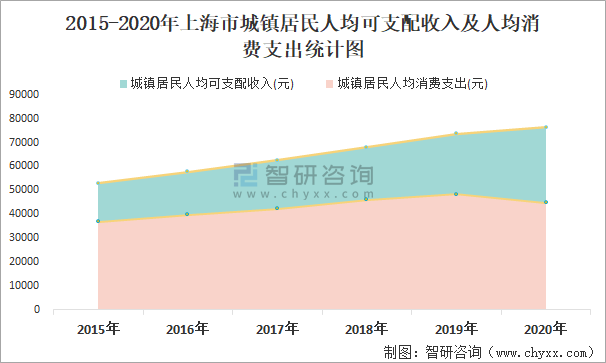 2015-2020年上海市城鎮居民人均可支配收入及人均消費支出統計圖