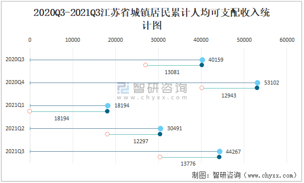 2020Q3-2021Q3江蘇省城鎮居民累計人均可支配收入統計圖