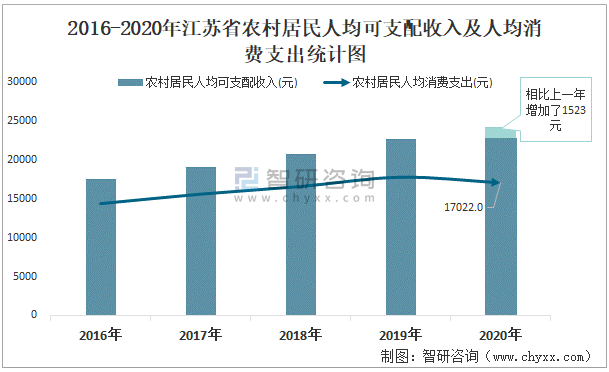 2015-2020年江蘇省農村居民人均可支配收入及人均消費支出統計圖