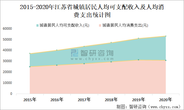 2015-2020年江蘇省城鎮居民人均可支配收入及人均消費支出統計圖