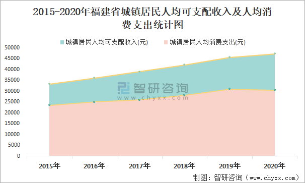 2015-2020年福建省城鎮(zhèn)居民人均可支配收入及人均消費(fèi)支出統(tǒng)計(jì)圖