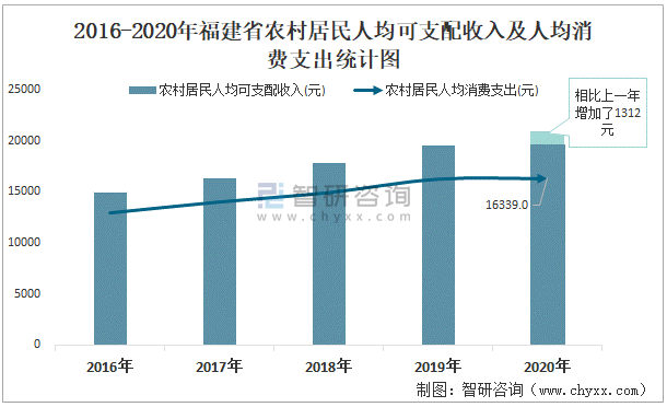 2015-2020年福建省農(nóng)村居民人均可支配收入及人均消費(fèi)支出統(tǒng)計(jì)圖