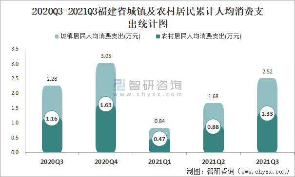 2021年第三季度福建省城鎮(zhèn)、農(nóng)村居民累計(jì)人均可支配收入同比增長10.43%,累計(jì)人均消費(fèi)支出同比增長12.03%