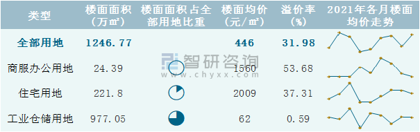 根據(jù)國信房地產(chǎn)信息網(wǎng)數(shù)據(jù)統(tǒng)計可知:2021年9月銀川市全部用地出讓地面均價為1024元/㎡,其中住宅用地出讓地面均價最高(2418元/㎡),全部用地成交地面均價為2155元/㎡,其中住宅用地成交地面均價為3717元/㎡,高于商服辦公用地成交地面均價;2021年1-9月銀川市工業(yè)倉儲用地樓面面積占其全部用地比重最多,為78.37%,溢價率為0.59%。