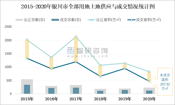 2015-2020年銀川市全部用地土地供應(yīng)與成交情況統(tǒng)計圖