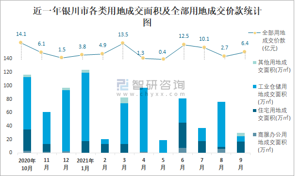 近一年銀川市各類用地成交面積及全部用地成交價款統(tǒng)計圖