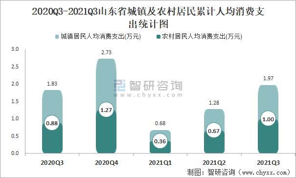 根據國家統計局數據顯示:2021年第三季度山東省城鎮居民人均消費支出為1.97萬元,同比增長7.98%,農村居民人均消費支出為1萬元,同比增長13.68%,城鎮居民人均消費支出是農村居民人均消費支出的1.97倍;2021年第三季度山東省城鎮居民人均消費支出占2020Q3-2021Q3山東省城鎮居民人均消費支出的23.24%,農村居民人均消費支出占比達到24%。