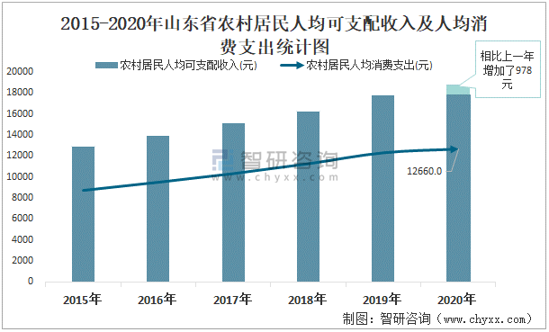 2015-2020年山東省農村居民人均可支配收入及人均消費支出統計圖