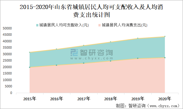 2015-2020年山東省城鎮居民人均可支配收入及人均消費支出統計圖