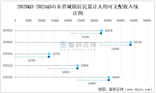 2020Q3-2021Q3山東省城鎮居民累計人均可支配收入統計圖