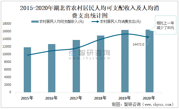 2015-2020年湖北省農(nóng)村居民人均可支配收入及人均消費(fèi)支出統(tǒng)計(jì)圖