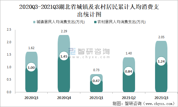 2020Q3-2021Q3湖北省城鎮(zhèn)及農(nóng)村居民累計(jì)人均消費(fèi)支出統(tǒng)計(jì)圖