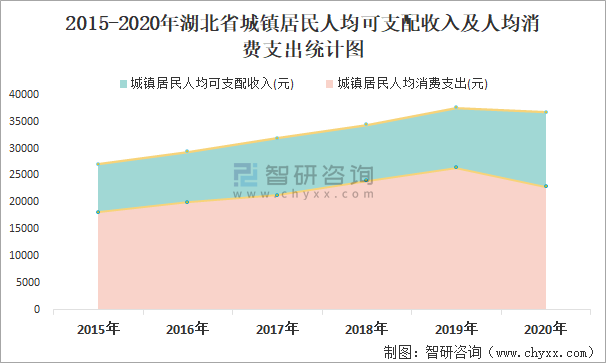2015-2020年湖北省城鎮(zhèn)居民人均可支配收入及人均消費(fèi)支出統(tǒng)計(jì)圖
