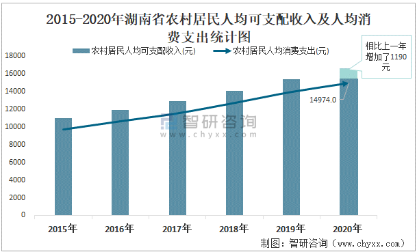 2015-2020年湖南省農村居民人均可支配收入及人均消費支出統計圖