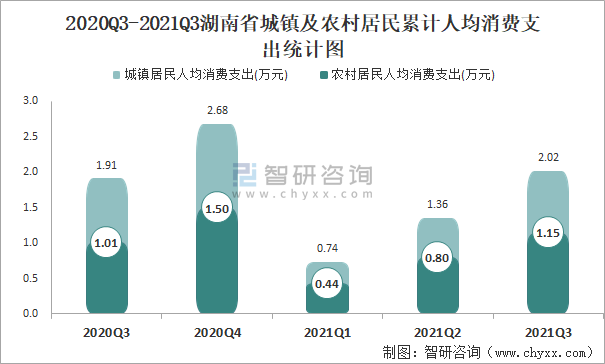 2020Q3-2021Q3湖南省城鎮及農村居民累計人均消費支出統計圖
