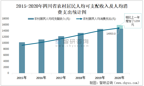 2015-2020年四川省農(nóng)村居民人均可支配收入及人均消費支出統(tǒng)計圖