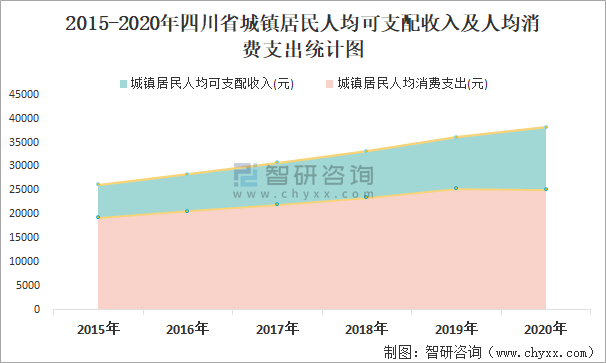 2015-2020年四川省城鎮(zhèn)居民人均可支配收入及人均消費支出統(tǒng)計圖