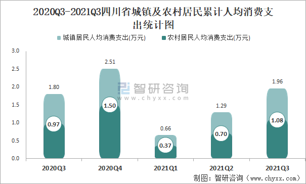 2020Q3-2021Q3四川省城鎮(zhèn)及農(nóng)村居民累計人均消費支出統(tǒng)計圖
