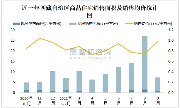 2021年9月西藏自治區銷售商品住宅7.26萬平方米 銷售均價約為0.98萬元/平方米