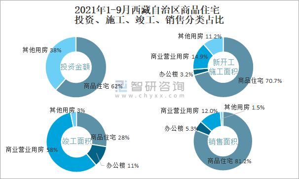 根據國家統計局數據統計可知:2021年1-9月西藏自治區房地產開發企業在商品住宅中投資金額占比為61.6%(注:只有投資金額中其他用房包含辦公樓、商業營業用房),商品住宅的新開工面積與竣工面積所占比重差異較大,從銷售面積來看,商品住宅為銷售主力(占比高達81.2%),辦公樓銷售面積占比少于商業營業用房銷售面積占比。