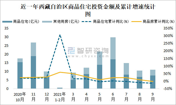根據國家統計局數據統計可知:2021年9月西藏自治區房地產開發投資商品房投資金額為11億元(其中商品住宅為7.58億元,辦公樓、商業營業用房等其他用房3.42億元);2021年1-9月西藏自治區房地產開發投資商品住宅累計投資金額為67.55億元,投資金額累計同比下降12.7%。
