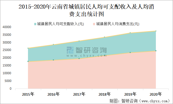 2015-2020年云南省城鎮居民人均可支配收入及人均消費支出統計圖