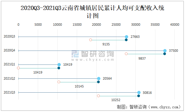 2020Q3-2021Q3云南省城鎮居民累計人均可支配收入統計圖