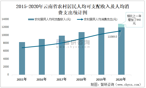 2015-2020年云南省農村居民人均可支配收入及人均消費支出統計圖
