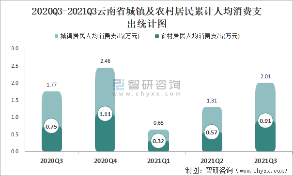 根據國家統計局數據顯示:2021年第三季度云南省城鎮居民人均消費支出為2.01萬元,同比增長13.9%,農村居民人均消費支出為0.91萬元,同比增長21.41%,城鎮居民人均消費支出是農村居民人均消費支出的2.21倍;2021年第三季度云南省城鎮居民人均消費支出占2020Q3-2021Q3云南省城鎮居民人均消費支出的24.56%,農村居民人均消費支出占比達到24.93%。